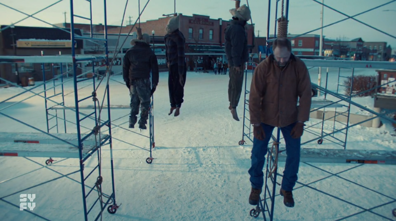 We open with where we left off last week, with people hanging in scaffolding with bags over their heads. Some of them don’t have shoes on, which is a weird fashion choice for Purgatory in the Winter. Did they not care about frostbite? Did they fall off? Or were they stolen and now some Purgatorian is walking around with a dead man’s shoes on? Also, some kids are playing hockey in front of hanging people. This must be the new normal then. Wynonna and Doc decide to go and get some of Wynonna’s favourite thinking juice in Shorty’s, but nope, this bar is dry AF! It has been turned into a juice bar which serves cocktails like ‘I Walk the Lime’ and ‘Cock Holliday’ – which isn’t really a cocktail and is just chicken soup which is probably not for the soul – and seems to have had a hipster explosion take over the surfaces and the walls, but everything that made it Shorty’s is still there, like the slot machines and Wynonna’s birthing pool table. Some things are just too good to get rid of.