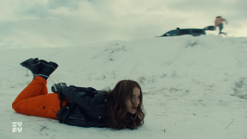The Magistrate has found her way to a giant snowbank and pushes Wynonna down after commenting about Wynonna not keeping her word. Who the hell is Cleo! Is she Eve or someone else! Whoever she is, she hasn’t learned how to hogtie with a rope yet and has to resort to using zip ties for the job and trusses Wynonna up. She even stabs her in the ass to make sure she screams to draw the people-eater in before heading up to her car to watch the show. The show is interrupted though with the arrival of Waverly and the Magistrate taking a short trip down the snowbank. She doesn’t stay there for long though and Waverly knocks her out before she can pull out a weapon. She doesn’t seem to have a gun in her hand though, it’s just the bag she had in Shorty’s. Maybe there’s something in there? Before Waverly can take out the people-eater, Nicole and Doc show up, rope and Super Skooshers in tow to de-crabify Nedley.