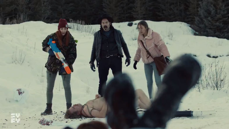Cue the slow-mo! I do love a good fight montage with an 80’s power ballad backing track. Doc clearly isn’t set for the rodeo circuit, but teamwork makes the dream work! They eventually pull the people-eater down, with Wynonna laughing in the background calling them idiots, to allow Nicole to spray him with what I can only assume is Rachel’s Kombucha. It really does have good microbes! The one thing it does not do though is to make clothes reappear with all three shocked to see a very naked Randy Nedley laying underneath them in the snow with a rope around him. He though seems to be even more surprised to see them and can’t remember what has happened in the last 18 months (three weeks and four days). Wynonna calls him a survivor, and we get one of the all-important ‘Fuck Yeah’s that we all fought for!