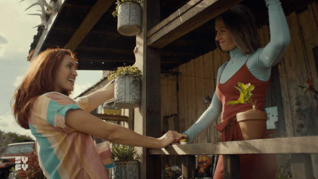 Wynonna and Waverly are out on their not as planned Earp Sister Day traipsing through knee height weeds in an abandoned play park with a trailer at the edge of the triangle only to discuss childhood trauma and how things aren’t going to change when Waverly gets married (seriously though they do but in good ways). Wynonna wants to focus on the mission and not where her leather pants may or may not be and how Waverly has everything so perfect while her lover has left her alone on the dance floor. The trailer awaits, and so does Casey who it seems is the extractor they are looking for!