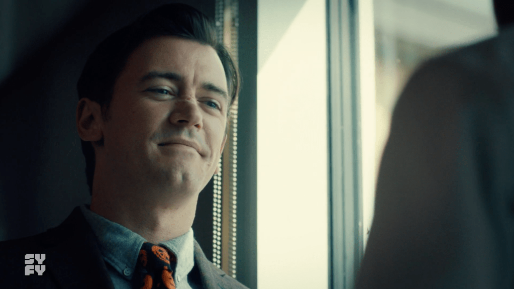 Doc’s Halloween night is a little more cloak, dagger and fire though. After capturing Amon, he brings his minions together in an area not so unlike the area Bobo Del Ray brought him to deal with Levi. Covering for Waverly and persuading the demons that Amon rigged the ‘game’ by dressing Waverly up as an angel before locking them all inside the bar while he cowered, he leaves Amon to his minions to deal with.