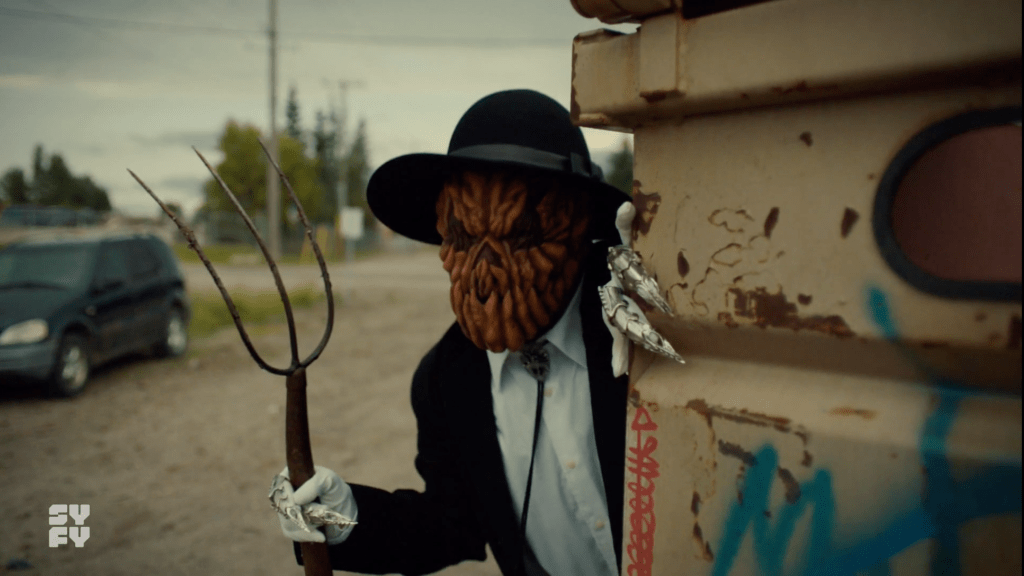 Tied up to a stripper pole is not how anyone would want to spend Halloween, well not while dressed as Super Wynonna and Butterfly Angel. The bidding starts to become more intense with someone appearing with a lobster claw for a hand, $50,000 to burn and a weird groin gesture. He pulls out a gun and places it to the neck of both Wynonna and Waverly but all that’s shot out is a dart restoring their minds. A Scooby doo mask reveal places one Jeremy Chetri behind the mask but it may be too little too late as the Murder Wheel spins of its own accord again and lands on The Angel.