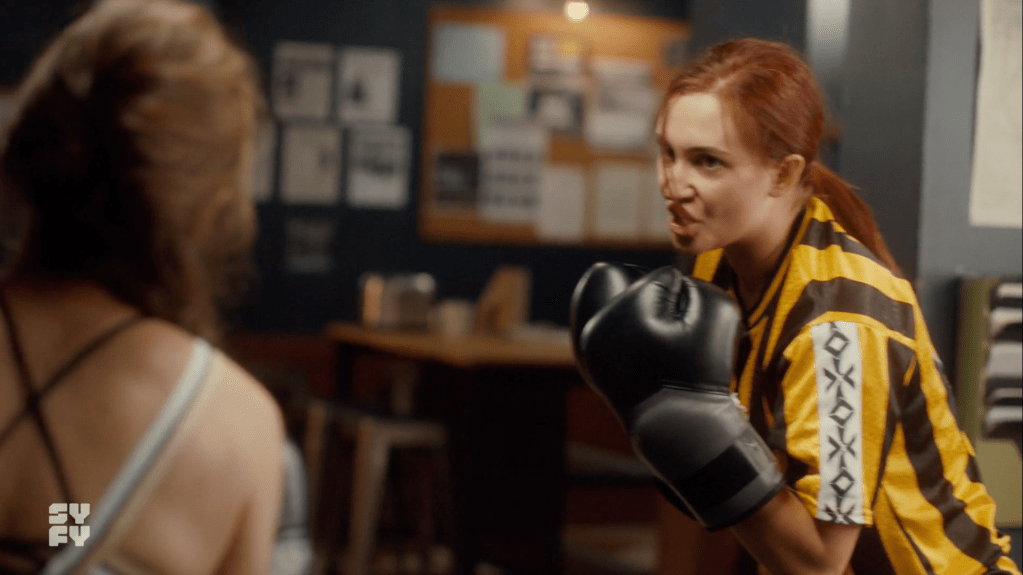 A real Purgatory Stand-Off is going down in the BBD offices between Nicole and Wynonna. Quips are not the only thing going down as the boxing gloves are on with the pair sparring only to be interrupted by Waverly. It is all a rouse to try and get Nicole back into the Cop Shop to try and get her to take up the mantle of Sheriff again (what with Holt being all shot dead by Wynonna and all that). Nicole’s boxing moves may need some work, but her deflections do not and she nopes out of there faster than me at a horror movie leaving Wynonna and Waverly to deal with the boring townfolk.