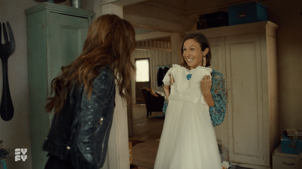 Waverly is at the Homestead unwrapping a box containing the exact same dress back in whatever year we are in now (18 months, 3 weeks and 4 days kinds screws with the math in my brain). That must have been an expensive dry-cleaning bill as there is not a trace of blood anywhere on that dress. Either way, it is Waverly’s wedding and Wynonna is just as excited as she is for it to finally be here.
