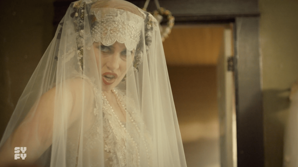 Turning up at Cursey’s Vintage Boutique, Doc and Wynonna head inside to the interior of the house covered in cobwebs and filled with creepy mannequins wearing all forms of wedding dress. One of these mannequins is not like the others. Instead of it being a mannequin, it is Charlotte Sullivan, dressed in a 1920’s style flapper dress ready to creep us all the fuck out. Wynonna tries to get her to remove the dress with Doc holding her at gunpoint, but the dress will apparently do its work. Breaking out into the creepiest song I’ve ever heard, she explains that the slaughter will begin when the wedding bells chime at the hands of the person who wears the dress. Easy right? Wynonna seems to think so and they just won’t chime the bells, because who does that now anyway? Seems the only thing to stop it is a silkworm as not even killing the woman will do the trick of breaking the enchantment.