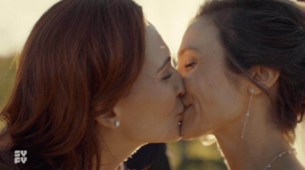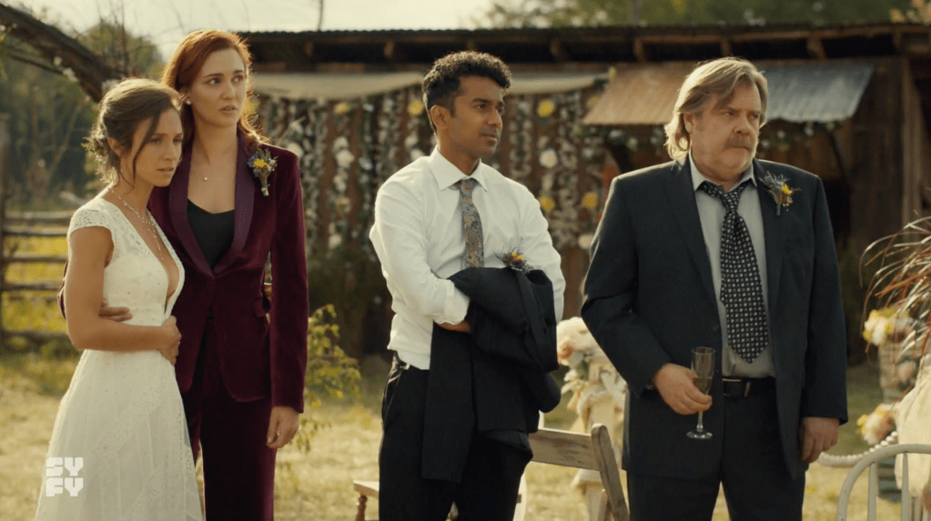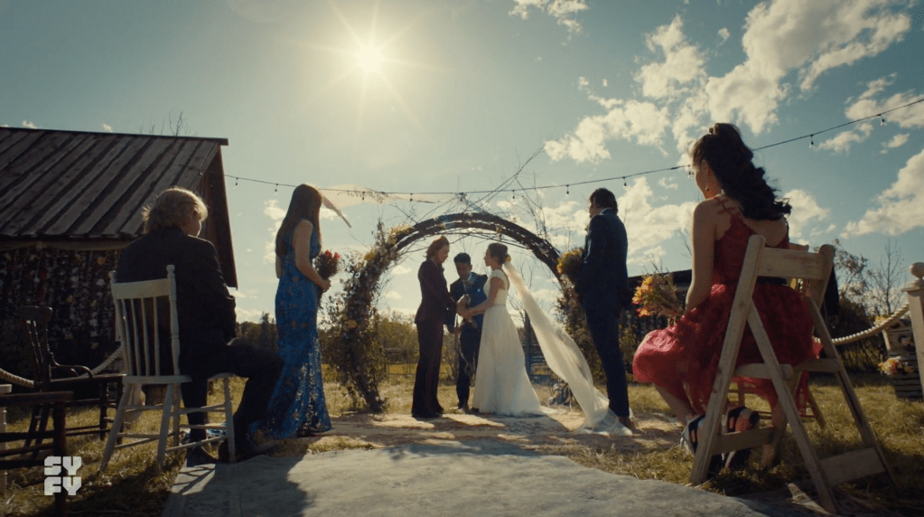 Banner re-hung, it is time for those nuptials already! With Rachel standing at the aisle with a short dress and trainers, and Jeremy all suited for his officiating duties, Nedley walks Nicole down the aisle lined with empty chairs. Then comes Doc in a stunning blue suit, open collar and no tie. Seriously. How do I get these suits? They are all breathtaking. Everyone is now there except for Wynonna and the other bride-to-be, Waverly. Our angel comes walking down the aisle looking like a vision accompanied by Wynonna who is ready to give away her baby girl. No one can take their eyes off her, especially Nicole who stands utterly transfixed. One forehead boop later and the two breakaway ready for Jeremy to begin.