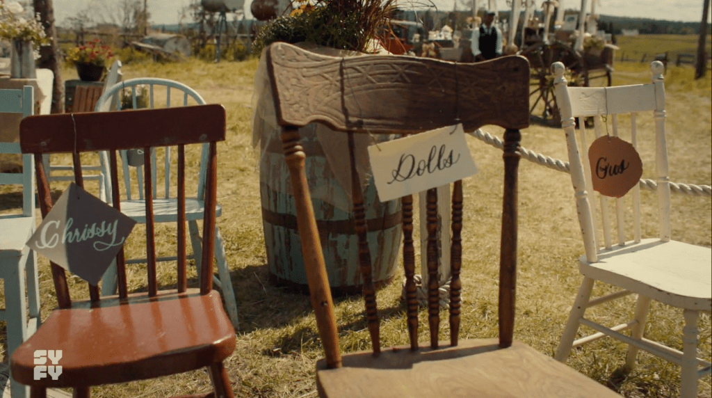 Murder Boards are the perfect replacement for seating charts. Well, seating charts are pretty much murder boards anyway, aren’t they? Deciding where people will sit so family members who don’t get along won’t murder each other before the main course. Sounds normal for a wedding. This one is trying to track down the mystery of the haunted wedding dress. They figure out that every wedding that’s ended in bloodshed in Purgatory goes back to this one wedding dress designed by Miss Brigitte Hogback of Cursey’s who was left at the alter in 1922 and was the first person to host her own red wedding. Looks like it’s getting Wayhaught in the barn with all the wedding talk. Who knew murder weddings could be such a turn on?
