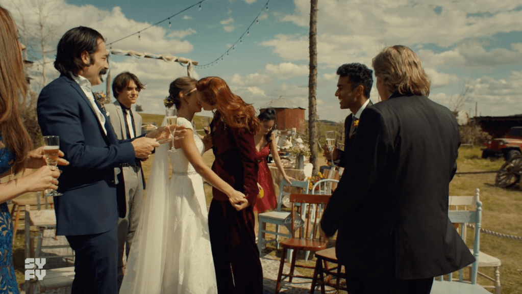 The champagne is chilled and ready for the toasts, but it is orange juice for Rachel and Billy (because papa Nedley is on the case). Rachel is first to step up with a toast/gift for the pair in the form of Martina singing the Wayhaught anthem ‘Wildwood’ by Fleurie. Talk about a callback! Wedding montages are my favourite. Dancing and toasts and cake and just all of the wedding things. I’ve been to a couple of weddings in my time but none seem as fun and carefree as this one. Even the bouquet toss with Jeremy catching it is perfection.